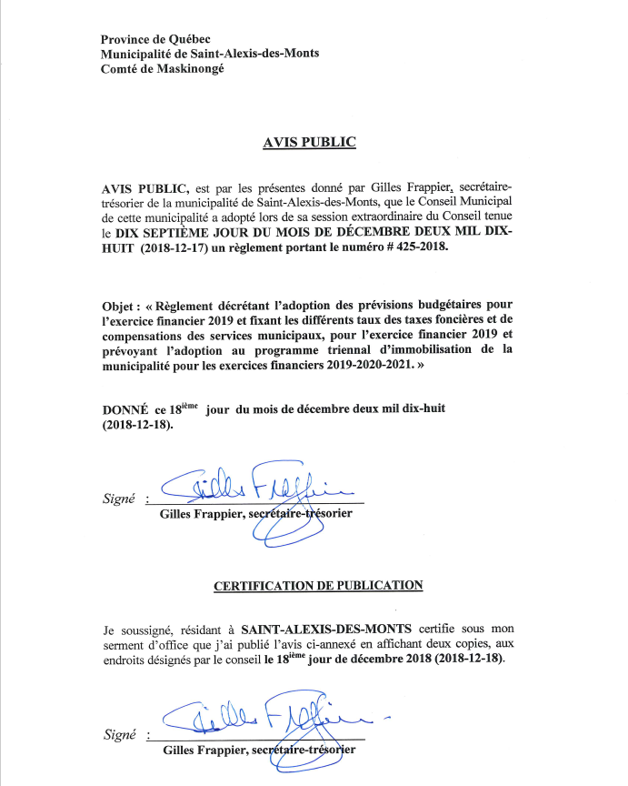 Avis public - Règlement 425-2019 / Règlement décrétant l'adoption des prévisions budgétaires pour l'exercice financier 2019 et fixant les différents taux des taxes foncières et de compensations des services municipaux pour l'exercice financier 2019